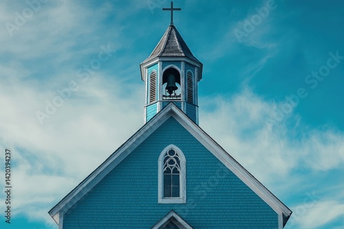 © Popelniushka, Fototapeta premium Colonial New England Church: Artistic Architecture with Bell Tower Under a Blue Sky