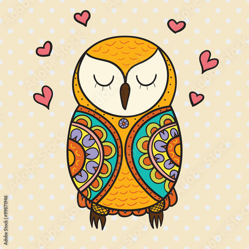 Fototapeta premium Color cute decorative ornamental Owl fall in love, vector doodle