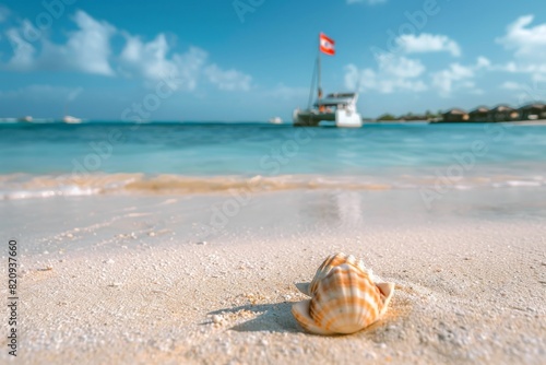 © ArtSpree, Obraz premium color flip-flops on white beach sand over blue transparent ocean wave background. Beautiful simple AI generated image in 4K, unique.