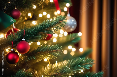 Fototapeta premium Color holiday baubles hanging on Christmas tree against blurred lights. High quality photo