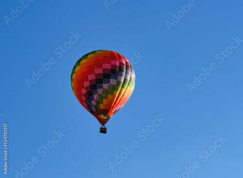 © rosinka79, Naklejka premium Color hot air balloon flying through the blue sky.
