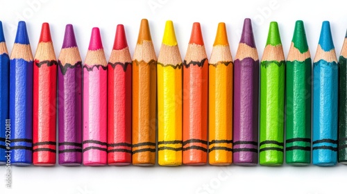 Fototapeta premium Color Pencil Rainbow Row, white background, closeup, art supplies, drawing,...