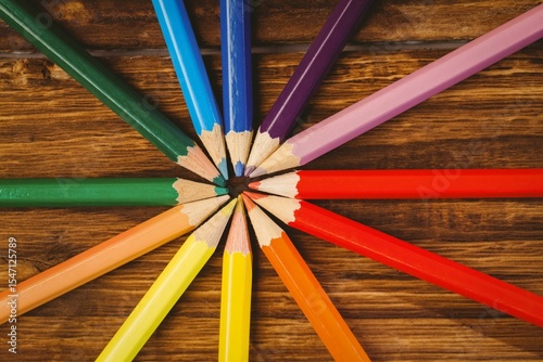 © vectorfusionart, Naklejka premium Color pencils arranged on wooden table