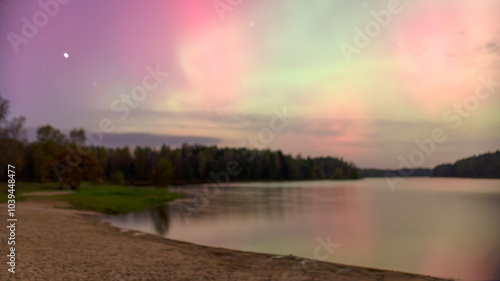 © ANDA, Fototapeta premium color photo with beautiful northern lights in the sky, northern lights over the lake