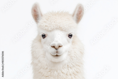 Obraz premium 2026 color trend. Fluffy white llama close-up portrait against a bright white background, showcasing its soft fur texture and gentle expression, perfect for animal lovers and nature enthusiasts