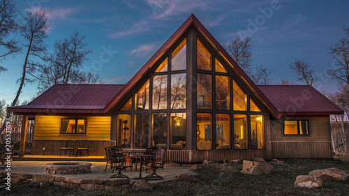 © spiritofamerica, Obraz premium Colorado A-Frame modern home at sunset, Hastings Mesa, Ridgway
