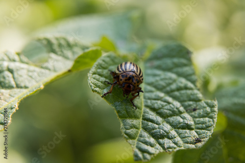 © Karter13, Fototapeta premium Colorado potato beetle eats potato leaves, close-up
