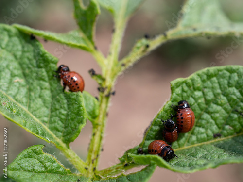 Fototapeta premium Colorado potato beetle larvae on young potato leaves