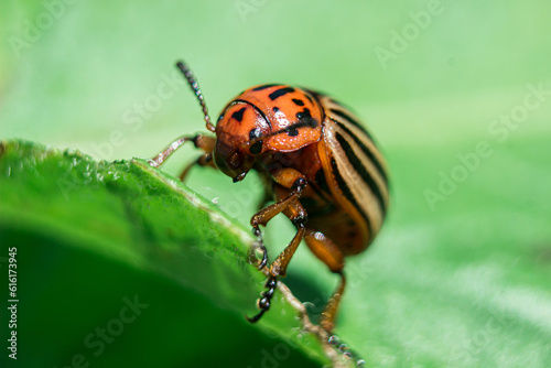 Fototapeta premium Colorado potato beetle on a green leaf with low depth of field