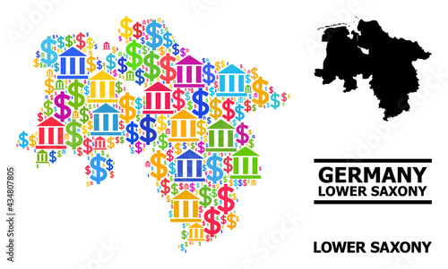 Naklejka premium Colored bank and money mosaic and solid map of Lower Saxony State. Map of...