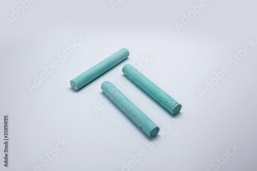 Fototapeta premium Colored chalk, in the form of small elongated cylinders in a wide variety of colors, used as school supplies for writing or drawing on a blackboard.