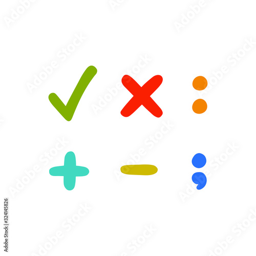 Fototapeta premium Colored characters symbols: check mark, multiplication sign, colon, plus, minus, semicolon.