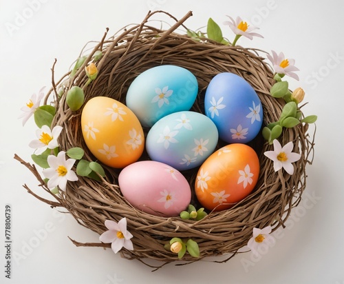 © cinematri, Obraz premium Colored Easter eggs in a nest.