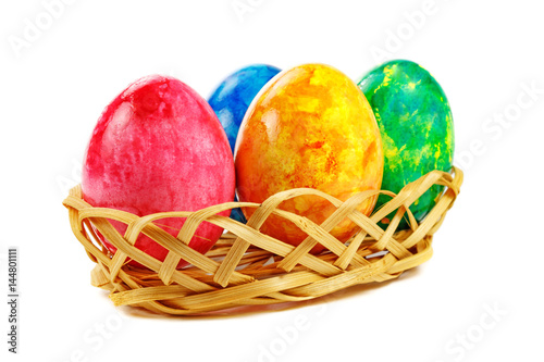 © Vladimir Zhupanenko, Obraz premium Colored Easter eggs in basket on white background