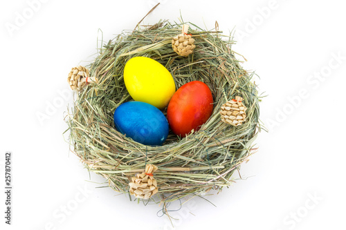 Obraz premium colored easter eggs in grass nest with bumps