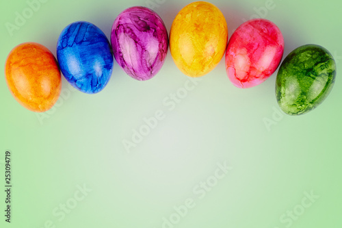 Obraz premium Colored Easter eggs on green background.