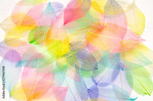 © oksanatukane, Fototapeta premium Colored leaves. Leaf texture pattern. Macro leaves background texture. Floral Design. Leaves. Rainbow colors. Transparent skeleton leaf with beautiful texture. leaf veins texture.