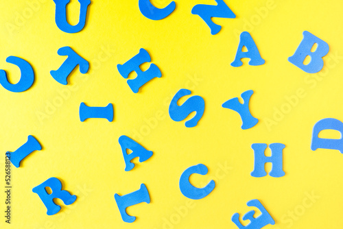 Fototapeta premium Colored letters of the alphabet on a yellow background. Educational game. learning through play.