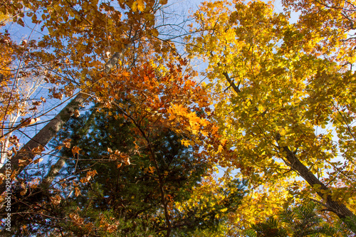 © Сергей Рамильцев, Fototapeta premium Colored maple leaves among the colorful autumn forest.