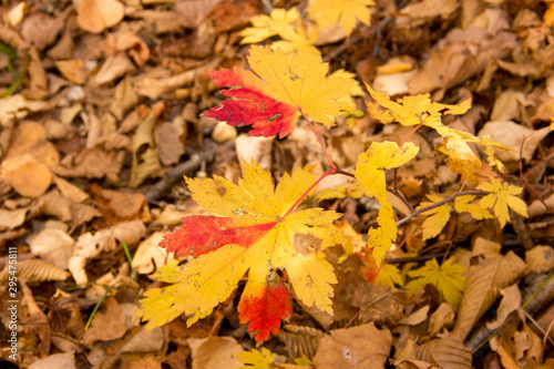 © Сергей Рамильцев, Obraz premium Colored maple leaves among the colorful autumn forest.