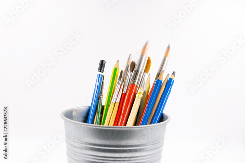 Fototapeta premium colored pencils and brushes to draw in jar, background