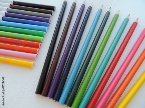 Obraz premium colored pencils, felt pens, plasticine on white background