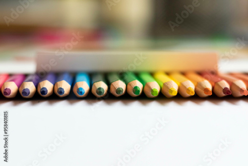 © Elsa, Naklejka premium Colored pencils, pencils, ruler, notebook, pencil sharpener and eraser. Material for back to school. Above the school table.