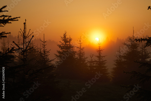 Fototapeta premium Colored sun rays through fir trees. Healthy green trees in a forest of old...