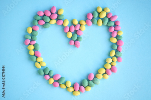 Obraz premium Colored sweets, peanut covered with glaze on blue background composition, heart shape, frame.