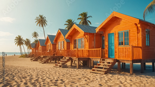 © tanya78, Obraz premium Colored wooden beach houses on a tropical shore