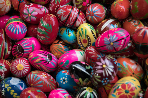 © Agata, Obraz premium Colored wooden eggs in krakow Poland