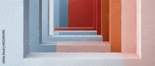 © XuperM, Fototapeta premium Colorful Abstract Architectural Interior Design with Geometric Shapes and Textured Walls