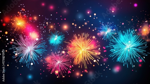 © Nice Seven, Naklejka premium Colorful Abstract Background with New Year Fireworks Display, Celebratory Sparkles, and Bright Light Effects in a Night Sky