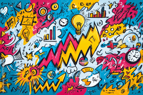 Naklejka premium Colorful abstract business and technology doodles with graphs, charts, light bulbs, arrows, and clocks on vibrant background