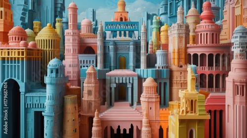 Fototapeta premium Colorful Abstract Cityscape of Temples and Castles Featuring Intricate Architectural Designs and Unique Structures in Pastel Hues