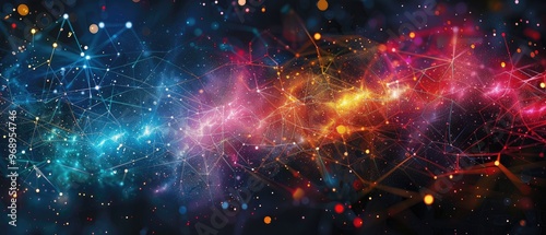 Obraz premium Colorful abstract cosmic background with interconnected particles and light,...