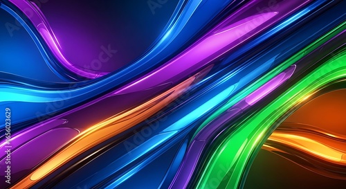 © Kristhai, Fototapeta premium Colorful abstract 3D wave lines with neon glow in blue purple green and orange, futuristic digital art background