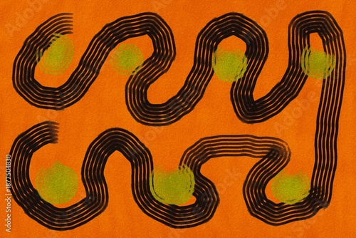 © Heart in pictures, Obraz premium Colorful abstract design with wavy lines and green circles on orange background