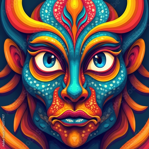 © Vadym, Naklejka premium Colorful abstract face art digital illustration displays vibrant design. Stylized creature mask big blue eyes, intricate patterns, bold hues. Red lips, orange horns, blue dotted skin. Psychedelic