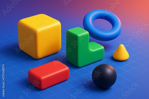 © Pixels Hunter, Obraz premium Colorful abstract geometric shapes with smooth textures and soft light on blue grid background with gradient lighting in modern digital style. Ai generative