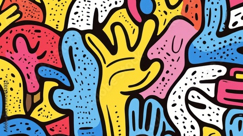 © Sakdecha, Obraz premium Colorful Abstract Hands and Shapes in Bold Pop Art Style Design