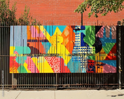 Fototapeta premium Colorful abstract mural on fence, urban backdrop, art installation, design