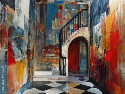 © Hanna, Fototapeta premium Colorful Abstract Painted Staircase Interior with Geometric Wall Art and Patterned Flooring