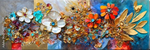 © Mohamed Salem, Naklejka premium Colorful abstract painting oil and water with 3d golden 24k