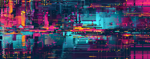 © Pixelmagic, Obraz premium Colorful Abstract Painting with Geometric Shapes and Grid Patterns, Showcasing Digital Aesthetics
