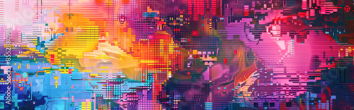 © Pixelmagic, Obraz premium Colorful Abstract Painting with Geometric Shapes and Grid Patterns, Showcasing Digital Aesthetics