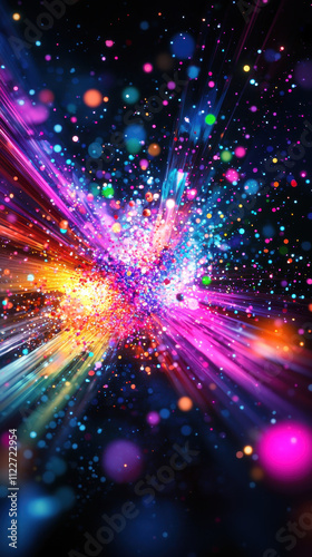 © JackBoiler, Obraz premium Colorful abstract representation of vibrant elements radiating light and energy, creating dynamic visual experience filled with bright dots and streaks