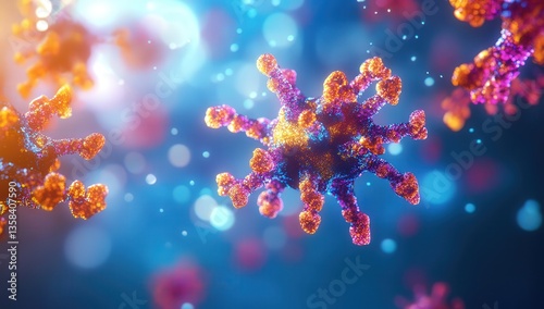 © Photique, Fototapeta premium Colorful abstract representation of virus particles in a vibrant blue light.