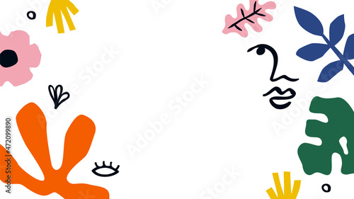 © Dedraw Studio, Fototapeta premium Colorful abstract shape background template. Empty white copy space frame with retro tropical nature decoration in matisse inspired art style.