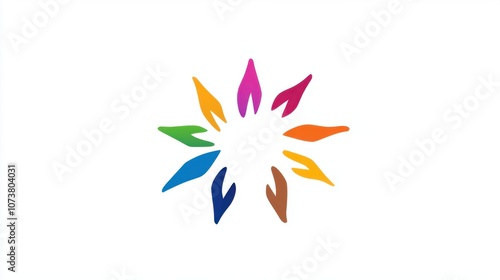 Fototapeta premium Colorful, abstract sun-like design with hand-like shapes in a circle, radiating outward
